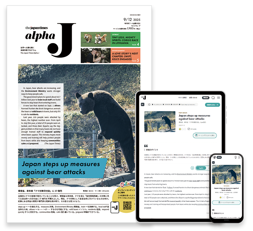 学習者向け英字新聞『The Japan Times Alpha J』から、中学3年〜高校2年生向けに学習効果の高いニュースを厳選。語彙・設問・解説つきで、授業に導入しやすい形にまとめた教材です。時事トピックを通して、「世界のいま」を英語で読み、考える力を育みます。