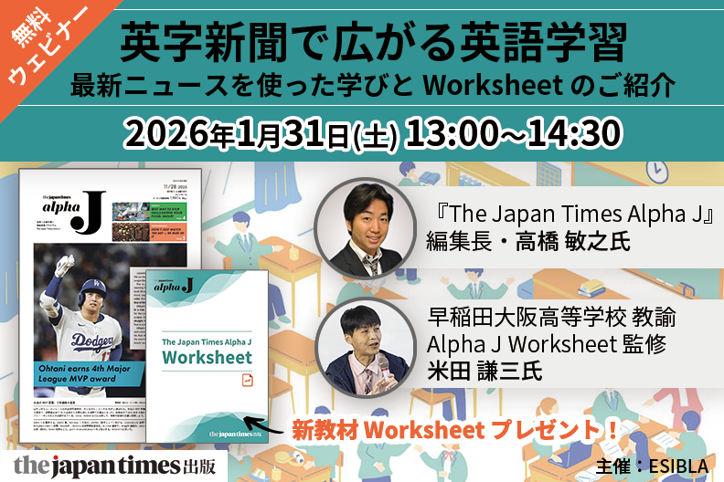 学習者向け英字新聞『The Japan Times Alpha J』から、中学3年〜高校2年生向けに学習効果の高いニュースを厳選。語彙・設問・解説つきで、授業に導入しやすい形にまとめた教材です。時事トピックを通して、「世界のいま」を英語で読み、考える力を育みます。
